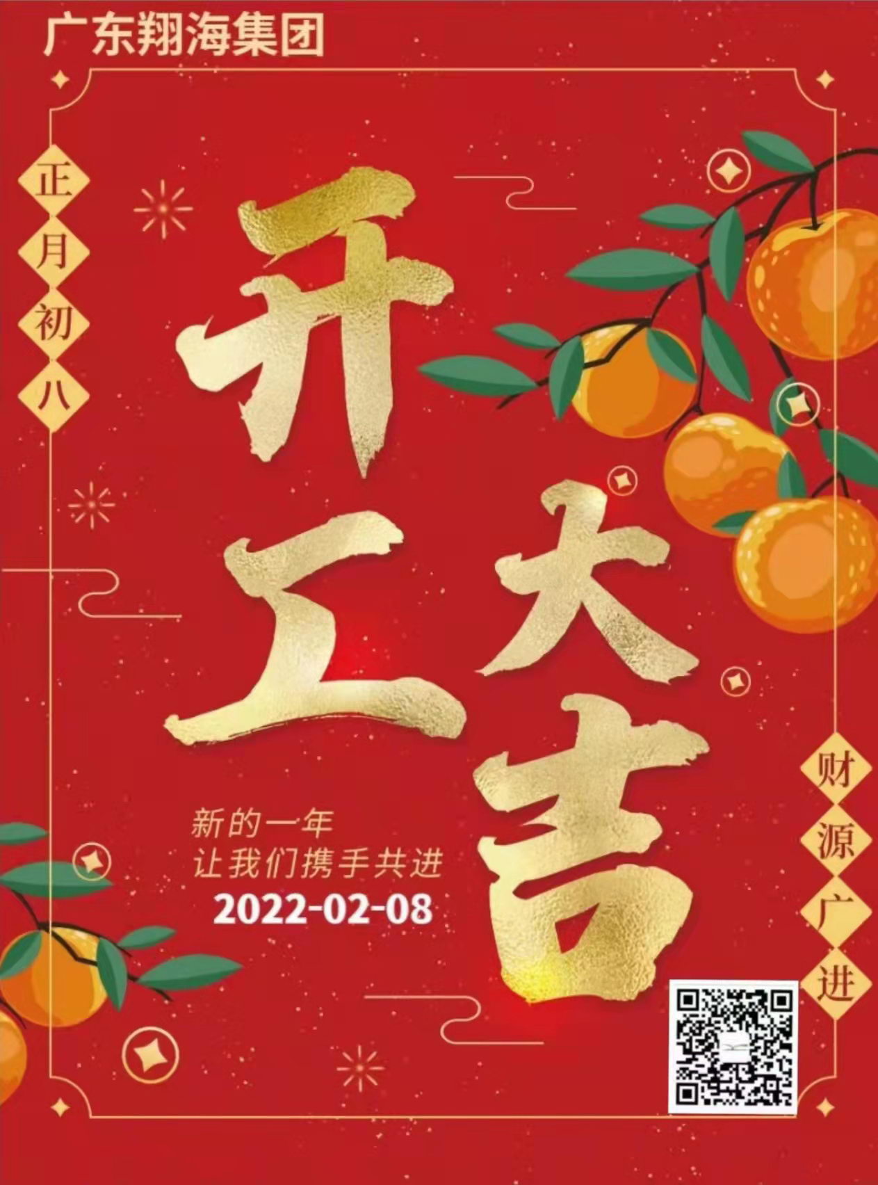 正月初八,廣東翔海集團恭祝各界同仁開工大吉,萬事如意,生意興隆,財源廣進! 新年伊始,讓我們懷著飽滿熱情,眾誌成城,披荊斬棘,砥礪前行,再創佳績!