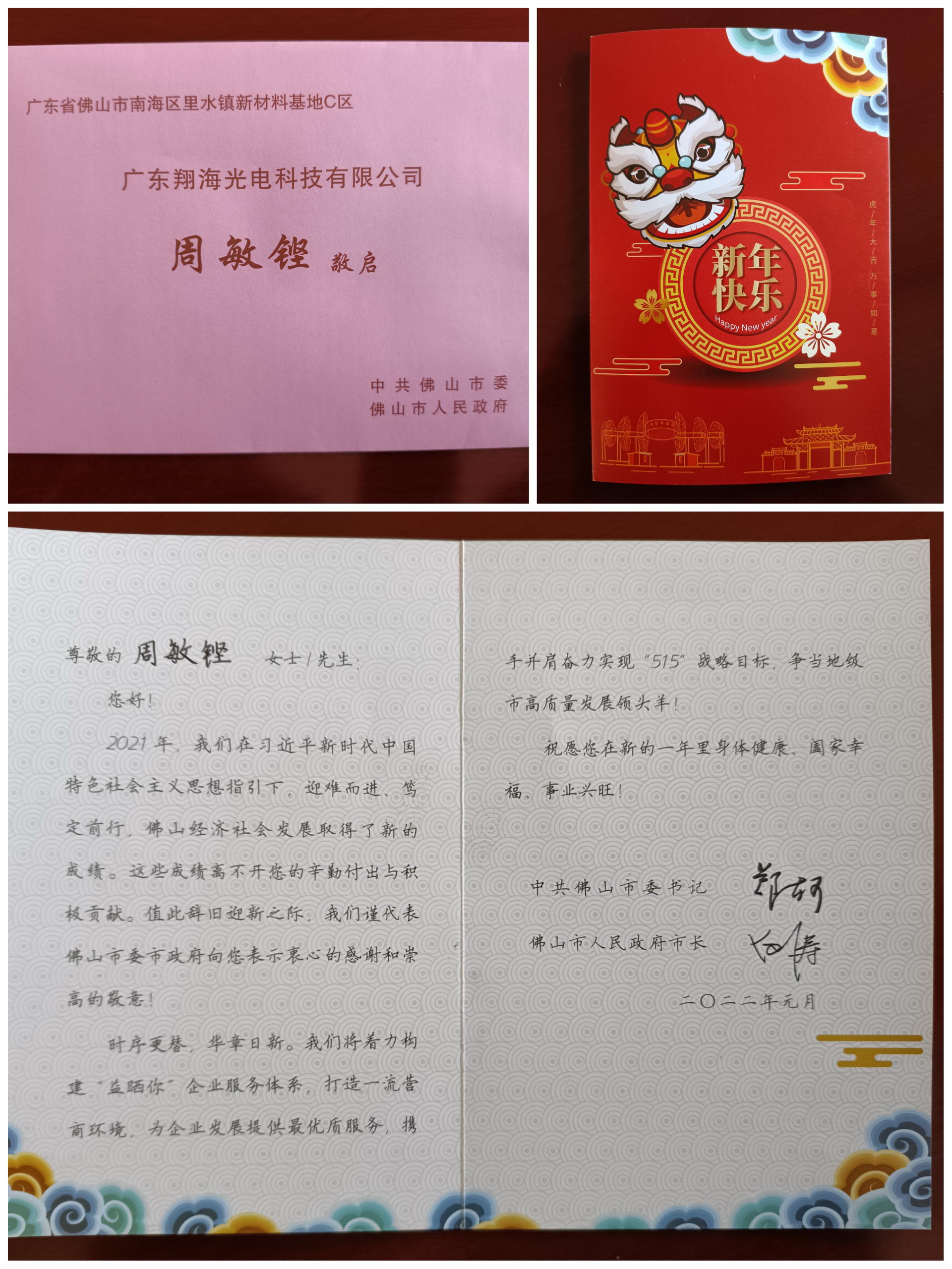 值此辞旧迎新之际,广东翔海开云集团中国有限公司官网有限公司收到了来自佛山市委、市政府的新年贺卡,深切感受到了党和政府对企业的关心与祝福,倍感温暖、备受鼓舞。